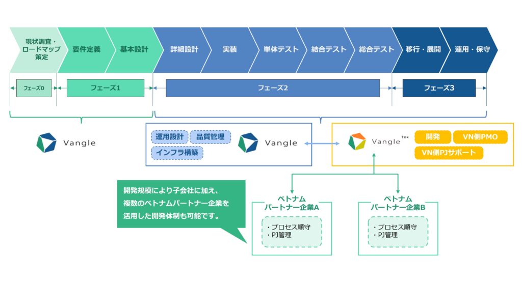 開発規模によってはVangle TekにPMOを立て、ベトナム現地のパートナー企業を活用したプロジェクト体制も実現できます。
